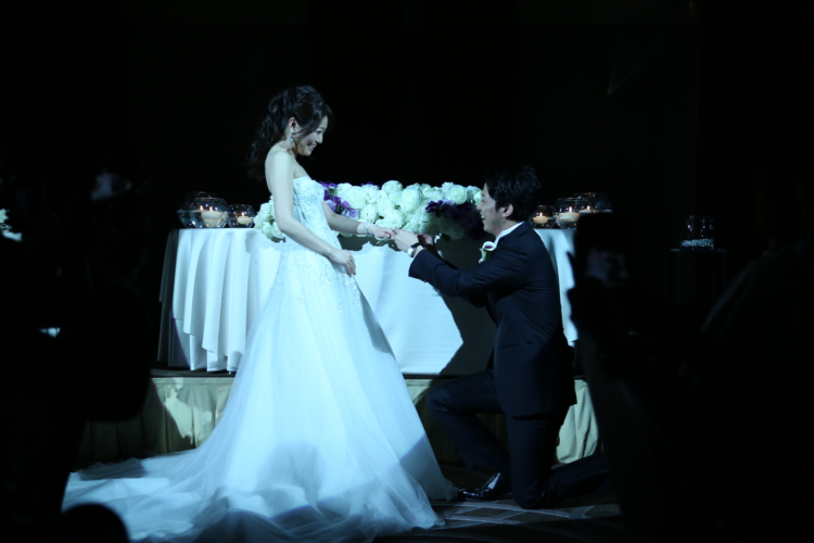 その後に行われた"エンゲージカバーセレモニー"では新郎様がひざまずき、改めて婚約指輪をはめていただくロマンチックな演出に!