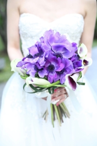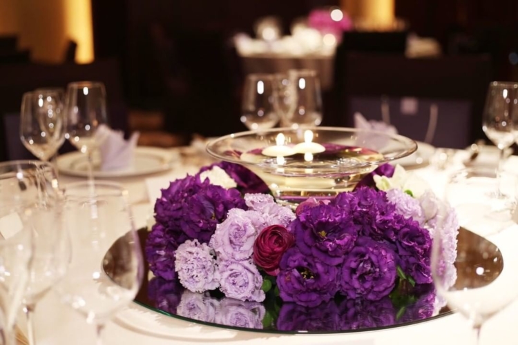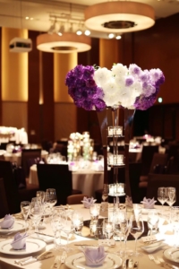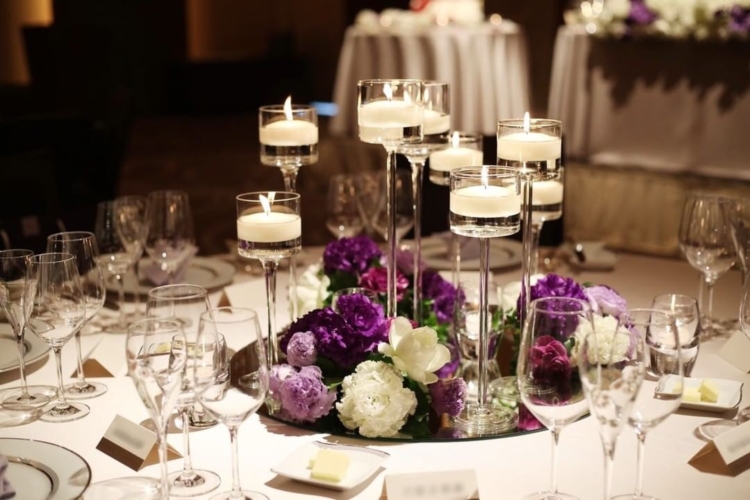 テーマカラーのパープルを取り入れてこだわったお花たち!後方のテーブルには背の高いもの、女性ゲストの多いテーブルには華やかなものを配置するなど、なんとテーブルごとに用意されたバリエーションは5パターンにも♡