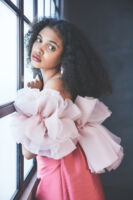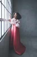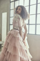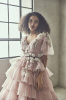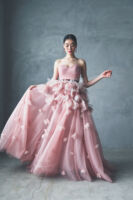 「Shade of Pink」と名付けたカラードレスのコレクションは、全て質感やトーンが異なるピンクのバリエーション。大人の女性が着たくなるPinkにこだわり、幾重にもトーンの異なるマテリアルを重ねたり、内側にIラインのシルエットのスカートを忍ばせたり、イタリア製のルージュのマテリアルの内側にはバイカラーのPinkを忍ばせたり、大人の遊び心を要所要所に忍ばせました。