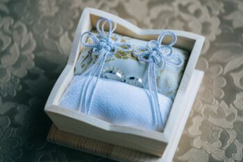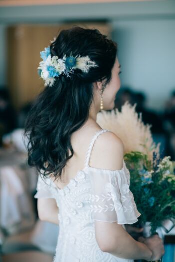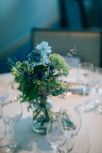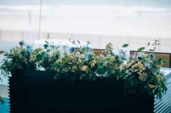 海が目の前の最高のロケーション 【 AMANDAN BLUE 鎌倉 】をお選びになったお二人。その景色を軸にPartyもコーディネート!和やかで気取らない雰囲気にしたいとつ準備をされたPartyは海と空の青にナチュラルなグリーンが映えて落ち着いた世界観に。