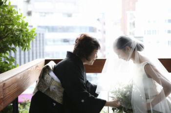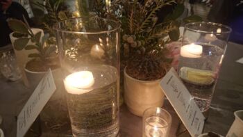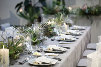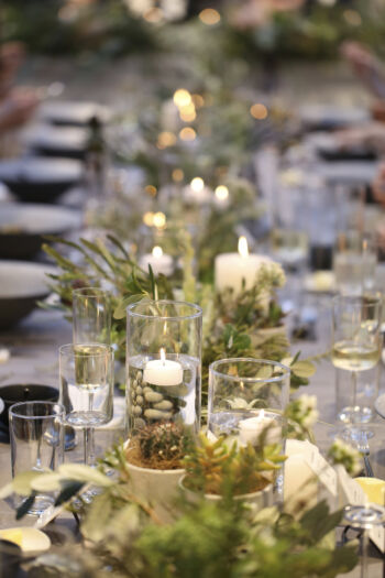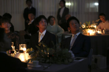 披露宴会場がガラスの天井で窓も大きく、外の光が入る会場だった為、夜にかけて披露宴会場が薄暗くなるのが際立つように、装花にろうそくもプラスして時間帯によって会場の雰囲気が変わる演出も!