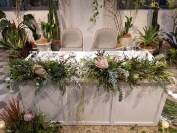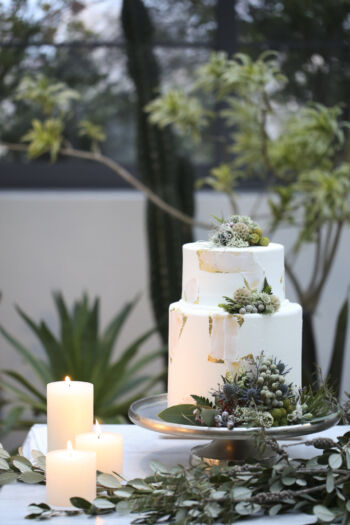 装花は大好きなサボテンをベースにしつつ、サボテンの存在感だけでポップになりすぎないように!と落ち着いた色のサボテンをチョイス。ドライフラワーやワイルドフラワーをポイントで使い、グレーやガラスを合わせたことでシンプルでおしゃれな統一感のあるコーディネートに♡