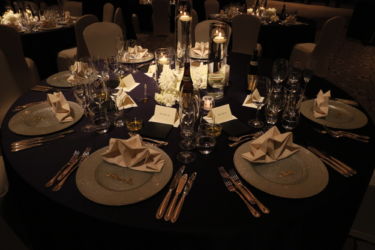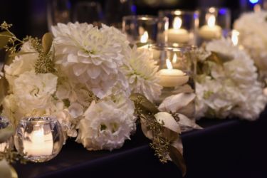 ホテルの重厚感と合う、シックな大人の雰囲気を意識!カラーはネイビー×ゴールド×ホワイトに統一し、照明は少し暗めにしてもらい、キャンドルをメインとした装飾にすることで、ムービングライトも映える会場に。ちなみに音楽はDJを採用し、エレガントな空間の中にダンスが合うクラブのような雰囲気に♡