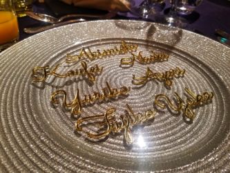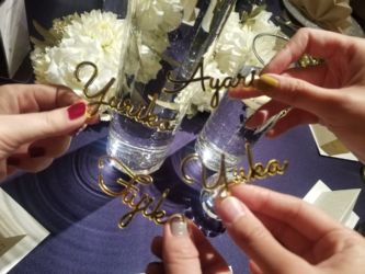 エスコートネームプレートはテーマカラーのひとつ、ゴールドで筆記体に♡当日双方のゲストが迷わないようにという想いでご用意されたおしゃれアイテムに、ゲストの多くが並べたり手にもったりしてたくさん写真を撮っていたそう!
