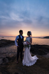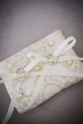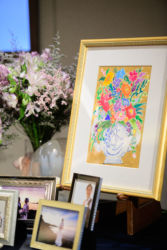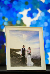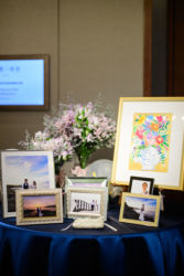 ウェルカムスペースには海辺の朝日と夕焼けのロケーションで撮影したウェディングフォトを。カメラマンはご新郎様のご友人(梅田健太様)で素敵に撮って頂きました。ブーケと花冠はお花の先生と朝市に買い付けまで行き自ら生花で作成!当日ウエディングスペースに飾るブーケも前日作成されたよう。画家のご友人が大好きなお花の絵をウェルカムスペースにと描いてくれたという素敵なエピソードも。リングピローはお母様の手作りの一品。