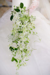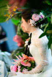 挙式、披露宴 ともに全てヘアードは生花に!挙式はマダガスカルジャスミンとデンファレをブーケに合わせて、ジャスミンは絶対髪とブーケに使いたい!と思っていたそう。