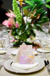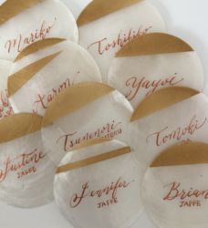 カピス貝で作ったカリグラフィーの席札は、テーブルセッティングのイメージに合うようなデザインやになるように色々なインクやニブを試しましたそう。そしてクオリティを少しでもあげる為にギリギリまで練習を重ねました。努力の賜物として素敵なアイテムが生まれたんですね♡