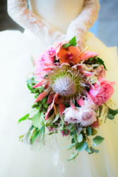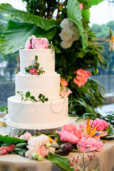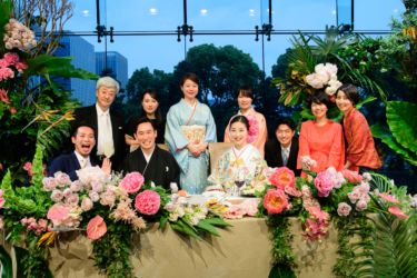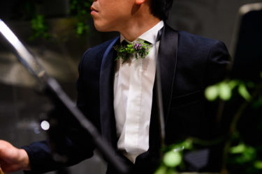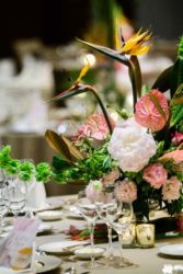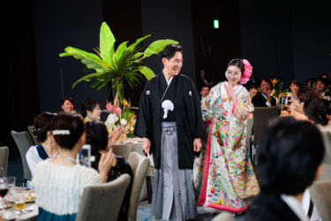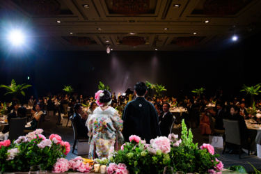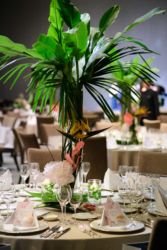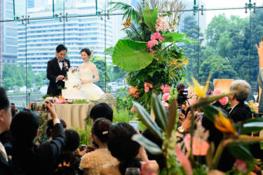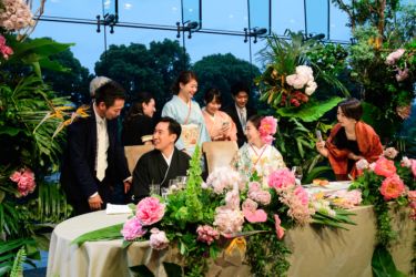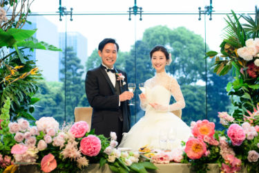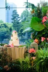 会場は世界観を作り上げるのが得意なMUKUの吉野さんへ依頼!2人にゆかりのある国をイメージし、《南国のジャングルをイメージしたエギゾチックな雰囲気》をガラス張り会場のロケーションを生かした形で、おしゃれかつ洗練された雰囲気で表現。お色直しの和装にも融合するように芍薬といった和の要素も織り交ぜました。テーブルには背の高いものと低いアレンジをして頂き、バランスよく配置。東京の中心とは思えない雰囲気づくりはまさに圧巻!