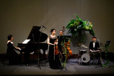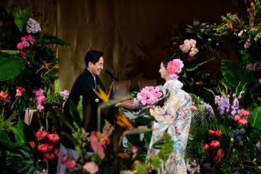 カルテットの生演奏を入れ演奏者さんにはお花を身につけて頂きジャングルの音楽隊をイメージ!学生時代よく聞いた懐かしい曲を中心に選曲し、JAZZ感溢れるお洒落なアレンジの演奏。ゲストには、生演奏という驚きと選曲が面白いと、とても好評で楽しんで頂けたようです。CDをかけてしまうと歌詞も入ってくるので直接的ですが、生演奏だとアレンジも加わり、懐かしいながらも新しい感じに生まれ変わりおすすめ!