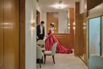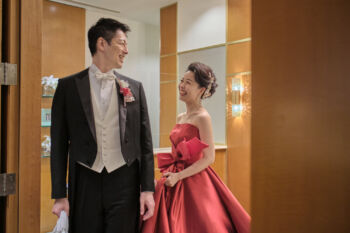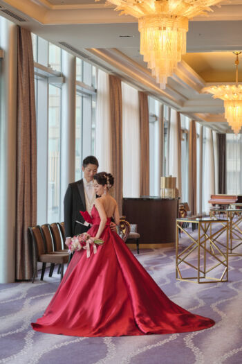 ミカドシルクの赤いドレスはイタリアから届いた卸たて。光沢感バッチリなドレスはゲストも釘付け♡