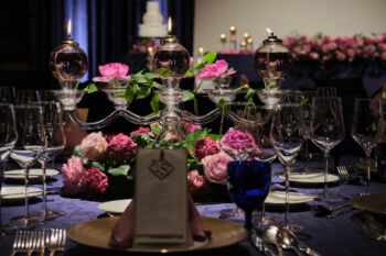 ロイヤルブルーのクロス、ピンクの濃淡のバラとトルコキキョウ、ゴールドのキャンドルで会場との相性抜群♡